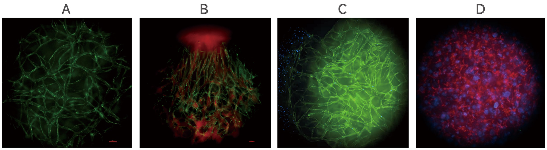 A.微血管网络。绿色:内皮细胞。B.三维血管灌注实验。绿色:内皮细胞;红色:葡聚糖(70kDa)。C.三维血管荧光微球灌注实验。绿色:内皮细胞;蓝色:直径为5μm的荧光微球。D.血管化类器官共培养。红色:内皮细胞,蓝色:肠癌类器官