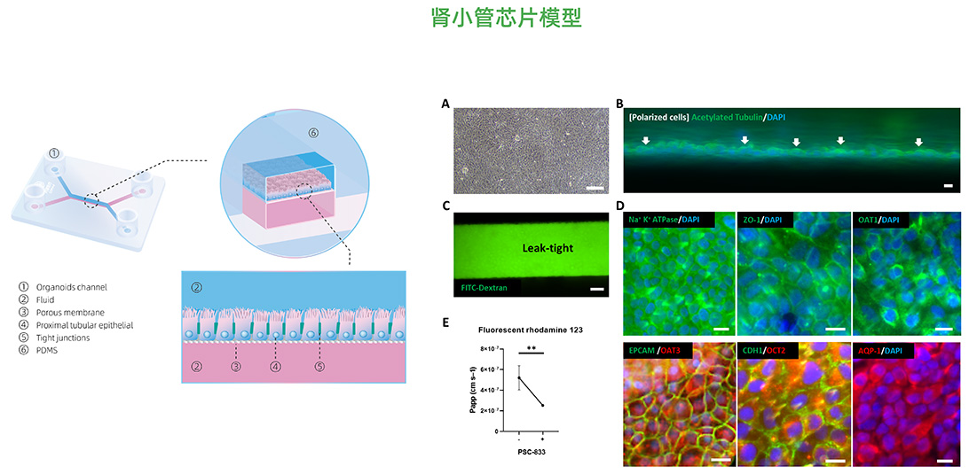 将肾小管类器官引入到屏障芯片(BFC芯片)上,肾小管类器官沿着流道在灌注室中培养,允许顶端和底部流体的刺激,接种后约在7天内能够形成单层的类肾小管结构(A),乙酰化微管蛋白的免疫荧光染色显示上皮紧密连接及荧光在内侧聚集,表明上皮细胞极化(B),为了确认芯片上屏障的完整性,向类器官流道内添加荧光探针 FITC-葡聚糖,FITC-葡聚糖保留在类器官流道内,表明芯片种肾屏障未受损无泄漏,屏障具有完整性(C)。芯片能够表达各种通道蛋白,包括Na+/K+ATP酶、Z0-1、AOP1、OAT1、OAT3、0CT2 等(D),表明芯片具有药物转运和代谢功能。在管的下层添加罗丹明123,孵育一段时间后,在顶端检测到荧光,表明跨上皮转运。而在P-gp 抑制剂PSC-833的作用下,渗透率降低,表明罗丹明123的流出依赖于P-qp功能,表明芯片的单向运输功能(E)。