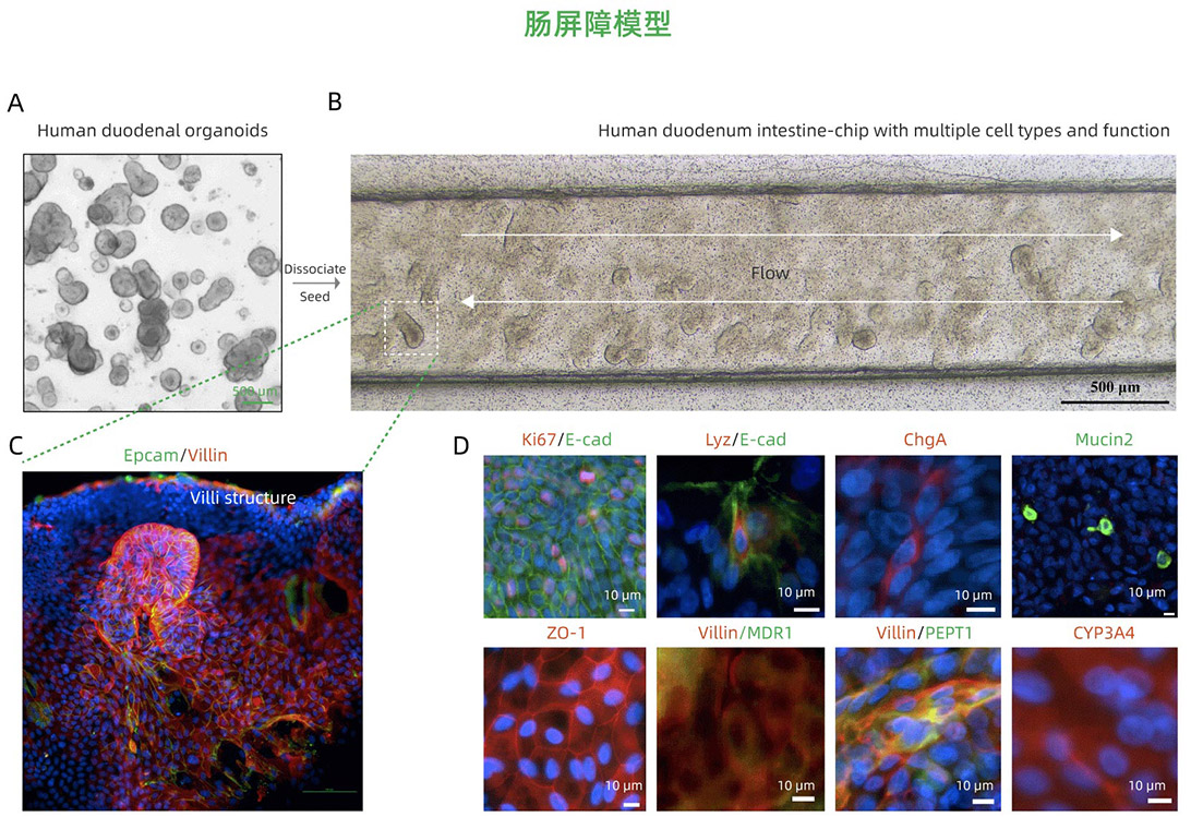 A.人源小肠十二指肠类器官在Matrigel中培养时的明场图片。B.芯片上在流体刺激下肠上皮细胞形成绒毛结构。C.绒毛结构放大图片,Vilin代表肠道顶端侧。D.芯片上细胞类型免疫荧光鉴定,证明包含主要肠细胞类型,包括吸收性肠细胞(vilin),杯状细胞(mucin2),潘氏细胞(lyz)以及肠内分泌细胞(ChgA)同时该芯片表达重要药物转运蛋白MDR1、PEPT1以及小肠主要药物代谢酶CYP3A4。
