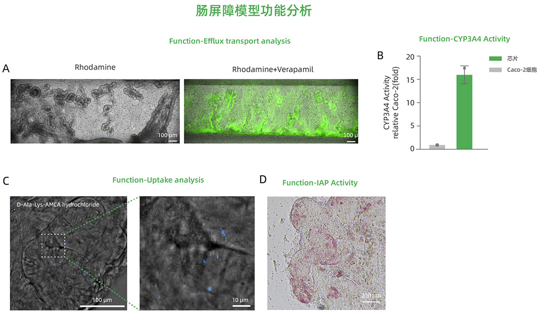 A.经验证,芯片具备外排泵MDR1介导的外排功能。Rhodamine123:MDR1的底物;verapami:MDR]抑制剂。B.芯片CYP3A4表达测定,证明该芯片比传统Cac0-2细胞系更县药物代谢能力。(.芯片县备摄取蛋白PEPT1介导的摄取功能。蓝色: PEPT1底物。D.芯片碱性磷酸酶分泌测定,代表成熟的肠上皮细胞功能。