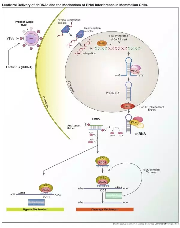 常规的shRNA加工过程会产生一个双链siRNA,每条链都能触发RNAi。这些siRNAs的功能链(引导链)随后载入到RISC复合体中,RISC复合体会将其引导到互补的靶位点并且催化靶mRNA的切割和降解。一个shRNA分子的引导序列经设计需要与靶序列完美互补。